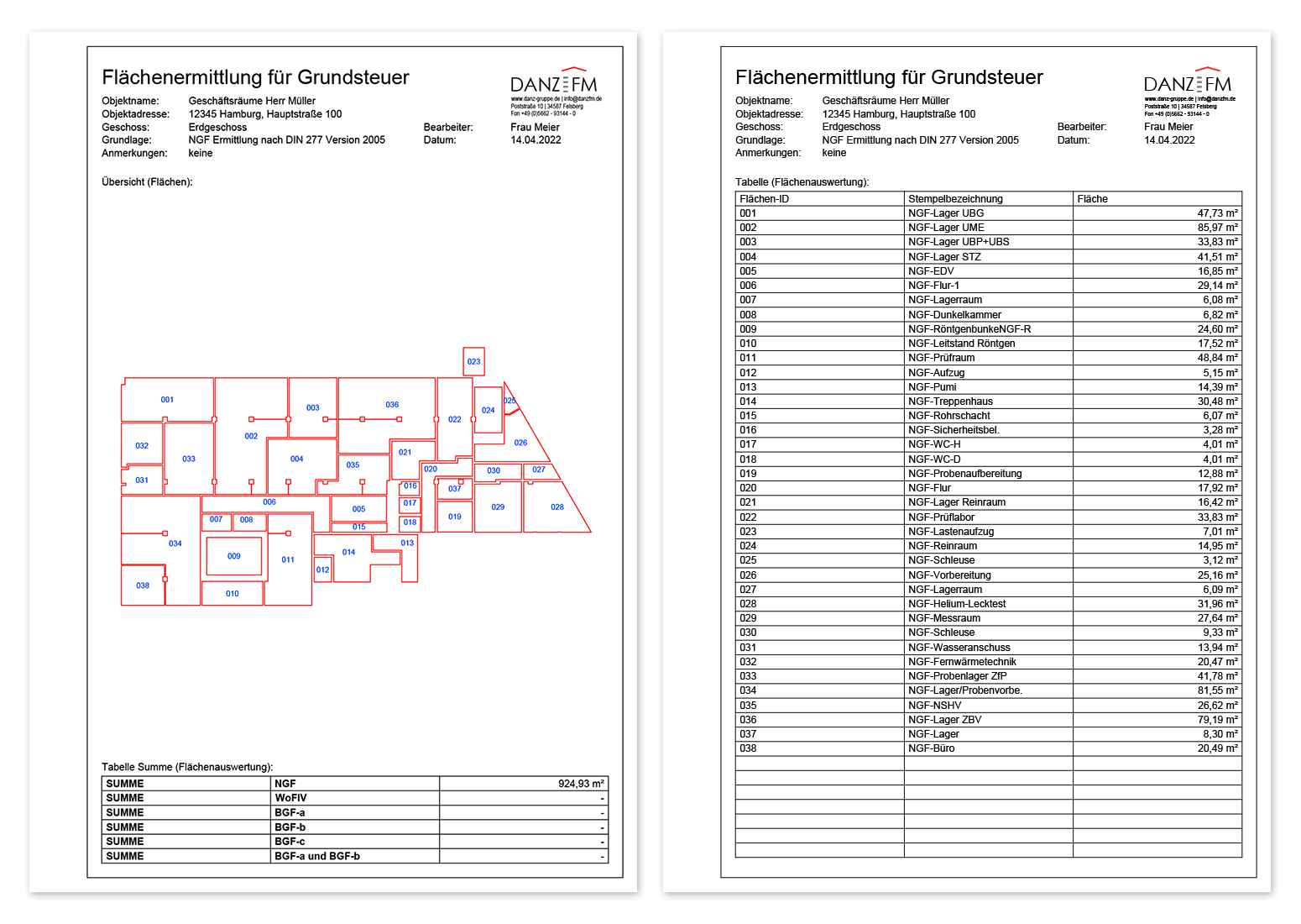 Zur Weitergabe z. B. an Ihren Steuerberater und zur Nachweisführung gegenüber dem Finanzamt liefern wir eine PDF-Dokumentation Ihrer Gebäudeflächen je Geschoss inklusive Zeichnung mit den umrandeten Gewerbeflächen, Wohnflächen, Nutzflächen und ihren Größen.